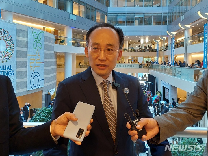 [워싱턴=뉴시스]김난영 특파원 = 추경호 경제부총리 겸 기획재정부장관이 14일(현지시간) 국제통화기금(IMF)·세계은행(WB) 연차총회 이후 특파원들과 대화하고 있다. [email protected] 2022.10.14.
