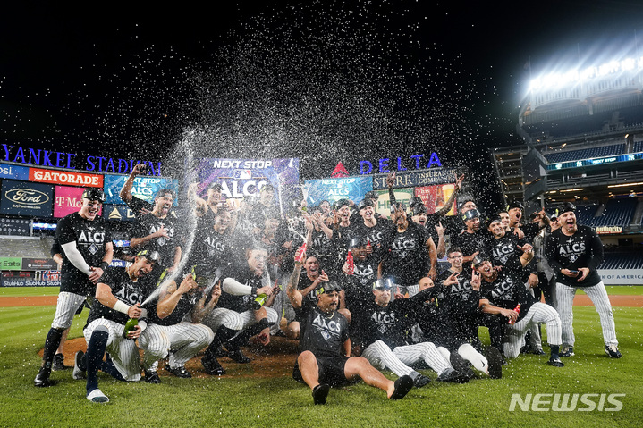 [뉴욕=AP/뉴시스] 뉴욕 양키스 선수들이 18일(현지시간) 뉴욕의 양키 스타디움에서 열린 2022 메이저리그 아메리칸리그 디비전시리즈(ALDS) 클리블랜드 가디언즈와의 5차전을 승리해 아메리칸리그 챔피언십시리즈(ALCS) 진출을 자축하고 있다. 양키스는 가디언스를 5-1로 물리쳐 3승 2패로 ALCS에 진출했다. 2022.10.19.