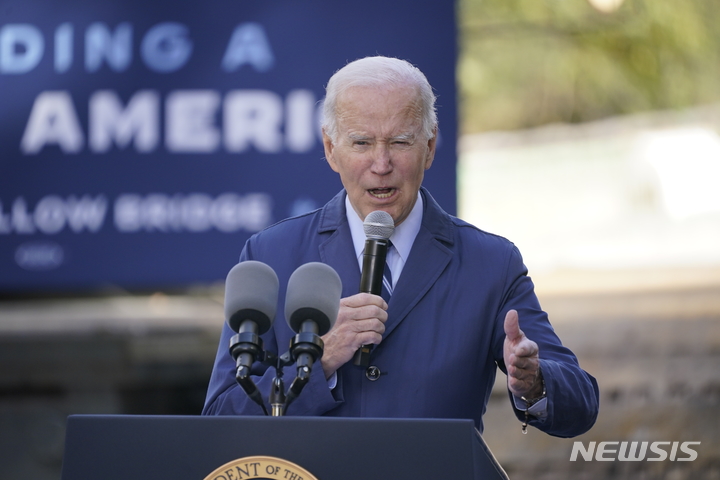 [피츠버그=AP/뉴시스] 조 바이든 대통령이 20일(현지시간) 펜실베이니아주 피츠버그의 펀 헬로우 다리에서 인프라법과 관련해 연설하고 있다. 바이든 대통령은 공화당이 중간선거에서 이길 경우 우크라이나 지원이 우려된다고 말했다. 앞서 케빈 매카시 공화당 하원 원내대표는 “우크라이나는 중요하지만, 그 일만 할 수는 없다"라며 정부의 우크라이나 지원에 제동을 걸겠다는 의사를 내비쳤었다. 2022.10.21.