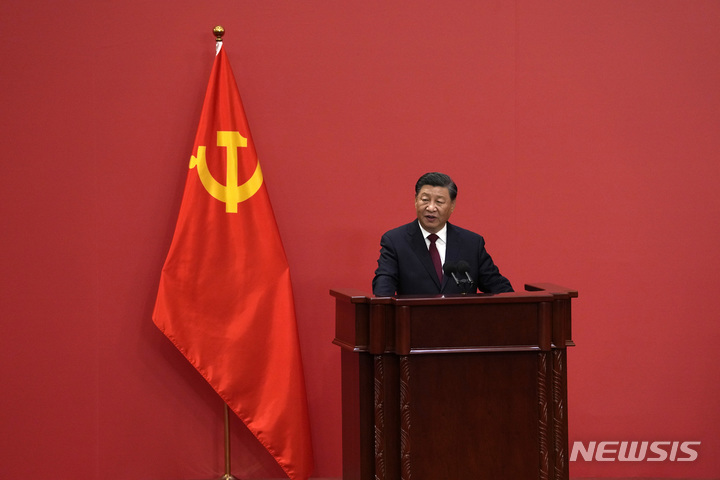 [베이징=AP/뉴시스]시진핑 중국 국가주석이 23일 베이징 인민대회당에서 집권 3기 최고 지도부를 발표하고 있다. 이날 중국 공산당 20기 중앙위원회 제1차 전체회의(1중전회)가 열려 시 주석 3연임이 공식 확정됐다. 2022.10.23.