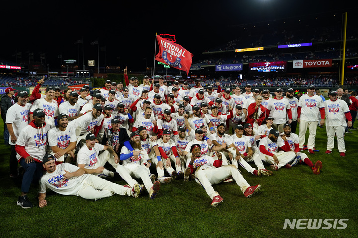 [필라델피아=AP/뉴시스] 필라델피아 필리스 선수단이 23일(현지시간) 미 펜실베이니아주 필라델피아의 시티즌스 뱅크 파크에서 열린 2022 메이저리그 내셔널리그 챔피언십시리즈(NLCS·7전 4선승제) 5차전에서 샌디에이고 파드리스를 물리치고 챔피언 자리에 올라 기념 촬영을 하고 있다. 필라델피아는 샌디에이고를 4-3으로 물리치고 시리즈 전적 4승 1패로 내셔널리그 챔피언 자리에 올랐다. 2022.10.24.