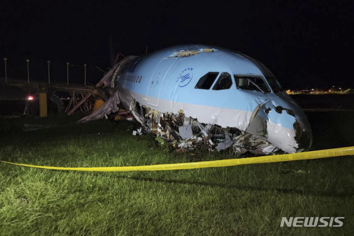 [세부=AP/뉴시스] 필리핀 민간항공청이 제공한 사진에 24일(현지시간) 대한항공 여객기가 필리핀 중부 세부 막탄 국제공항에서 활주로를 지나쳐 파손돼 있다. 인천공항에서 23일 오후 출발한 대한항공 KE631 여객기가 24일 늦은 시각 현지 기상 악화로 3차례 착륙 시도 끝에 활주로를 지나쳐 착륙해 파손됐으며 탑승자 173명 전원은 무사한 것으로 알려졌다. 2022.10.24.