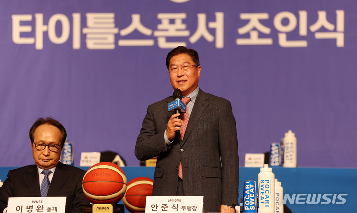 [서울=뉴시스] 백동현 기자 = 안준식 신한은행 부행장이 24일 오전 서울 영등포구 63컨벤션센터에서 열린 신한은행 SOL 2022-2023 여자프로농구 타이틀스폰서 조인식 및 미디어데이에 참석해 인사말하고 있다. 2022.10.24. [email protected]