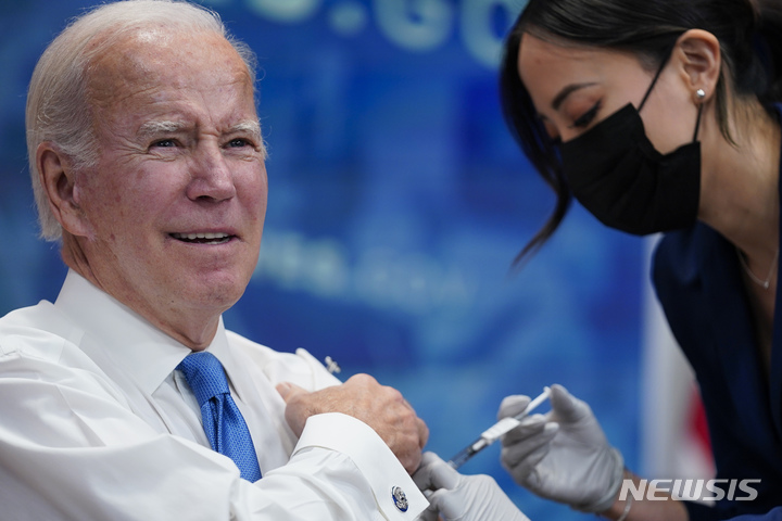 [워싱턴=AP/뉴시스] 조 바이든 미국 대통령이 25일(현지시간) 백악관 사우스코트 강당에서 백악관 의료진으로부터 코로나19 개량 백신을 접종하고 있다. 바이든 대통령은 접종 후 "백신 접종은 정치적인 것과는 무관"하다며 "당신과 당신이 사랑하는 이들의 건강과 관련된 일"이라고 강조했다. 2022.10.26.
