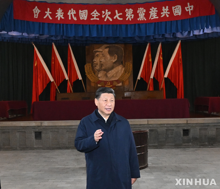 [옌안=신화/뉴시스] 시진핑 중국 국가주석이 27일(현지시간) 중국 공산당 혁명 성지인 산시성 옌안을 방문해 1945년 중국 공산당 제7차 전국대표대회(CPC)가 열렸던 현장을 둘러보고 있다. 시 주석은 측근들로 구성된 새 최고지도부를 이끌고 옌안을 방문해 마오쩌둥 전 주석의 옛집 등을 둘러보고 옌안혁명기념관에서 전시를 관람했다. 2022.10.28.