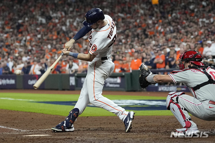 [휴스턴=AP/뉴시스] 휴스턴 애스트로스의 카일 터커가 28일(현지시간) 미 텍사스주 휴스턴의 미닛 메이드 파크에서 열린 2022 메이저리그 월드시리즈(WS, 7전4승제) 1차전 필라델피아 필리스와의 경기 3회 말 3점 홈런을 치고 있다. 터커는 2회 말에도 1점 홈런을 쳐냈다 2022.10.29.