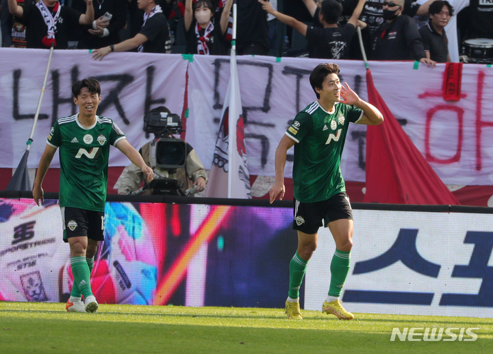 [전주=뉴시스] 김얼 기자 = 2022 하나원큐 FA컵 결승 2차전 전북현대와 서울 FC 경기가 열린 30일 전북 전주시 전주월드컵경기장에서 전북현대 조규성 선수가 골을 넣고 세리머니를 하고 있다. 2022.10.30. [email protected]