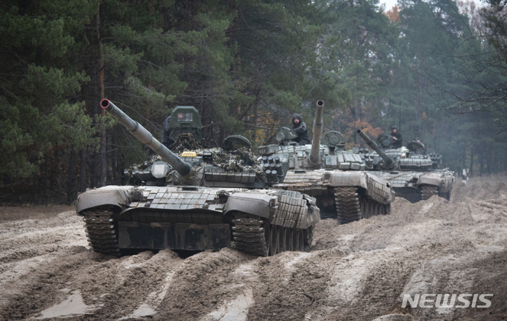 [체르니히우=AP/뉴시스] 지난달 28일(현지시간) 우크라이나 체르니히우주 벨라루스와의 국경 부근에서 우크라이나 군인들이 포획한 러시아군의 T-72 전차에 탑승해 훈련하고 있다. 2022.11.01.
