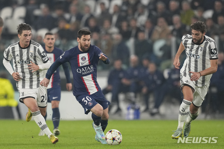 [토리노=AP/뉴시스] 파리 생제르맹의 리오넬 메시가 2일(현지시간) 이탈리아 토리노의 알리안츠 아레나에서 열린 2022-23 유럽축구연맹(UEFA) 챔피언스리그 H조 6차전 유벤투스(이탈리아)와의 경기 중 드리블하고 있다. PSG는 킬리앙 음바페의 1골 1도움으로 2-1로 승리하며 16강에 진출했다. 2022.11.03.