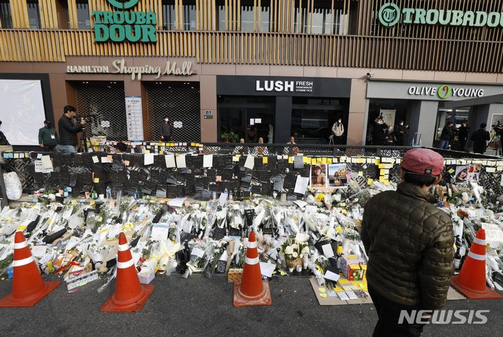 [서울=뉴시스] 고승민 기자 = 3일 서울 용산구 이태원역 1번 출구 앞에 마련된 '이태원 사고' 희생자 추모 공간에서 시민들이 희생자들을 추모하고 있다. 2022.11.03. [email protected]
