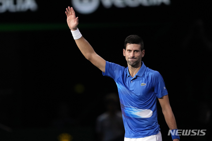 [파리=AP/뉴시스] 노바크 조코비치(7위·세르비아)가 3일(현지시간) 프랑스 파리에서 열린 남자프로테니스(ATP) 투어 롤렉스 파리 마스터스 3회전에서 카렌 카차노프(19위·러시아)를 물리치고 기뻐하고 있다. 조코비치는 카차노프를 세트 스코어 2-0(6-4 6-1)로 물리치고 8강에 합류했다. 2022.11.04.
