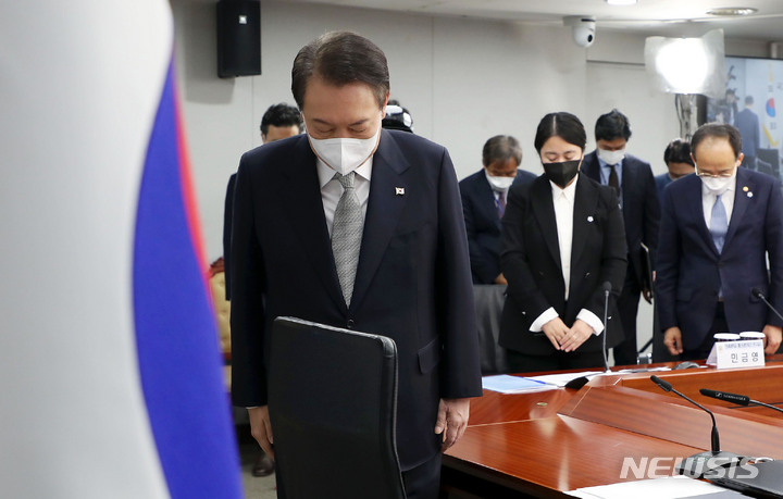 [서울=뉴시스] 홍효식 기자 = 윤석열 대통령이 7일 서울 용산 대통령실 청사에서 열린 국가안전시스템 점검회의에서 이태원 참사 희생자에 대한 묵념을 하고 있다. 2022.11.07. [email protected]
