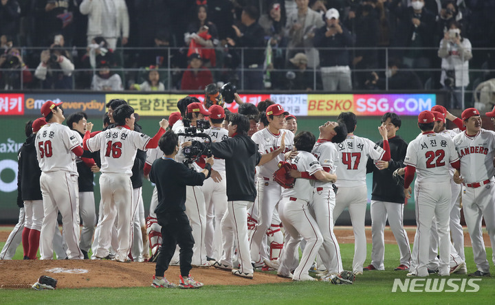 [인천=뉴시스] 조수정 기자 = 8일 인천 SSG랜더스필드에서 열린 2022 KBO 한국시리즈 6차전 키움 히어로즈와 SSG 랜더스의 경기, 5-4로 4선승 하며 한국시리즈 우승을 차지한 SSG 선수들이 기쁨을 나누고 있다. 2022.11.08. [email protected]