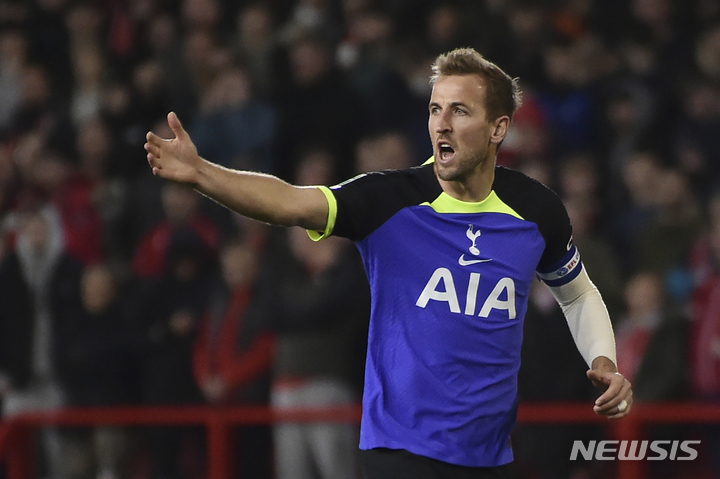 [노팅엄=AP/뉴시스] 토트넘 홋스퍼의 해리 케인이 9일(현지시간) 영국 노팅엄의 시티 그라운드에서 열린 2022-23시즌 카라바오(EFL)컵 3라운드(32강전) 노팅엄 포레스트와 경기하고 있다. 손흥민이 부상으로 빠진 토트넘은 리그 최하위 노팅엄에 0-2로 패하며 탈락했다. 2022.11.10.