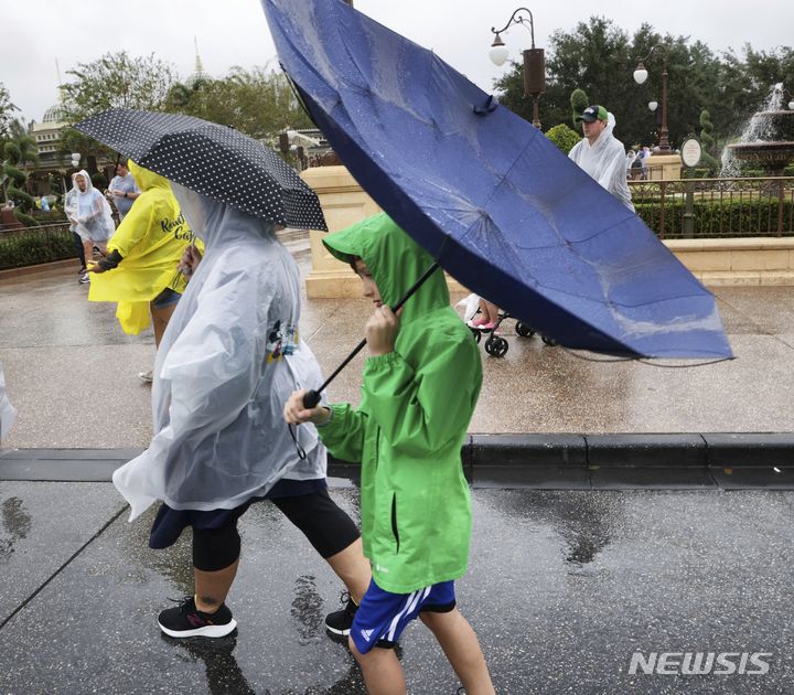 [레이크부에나비스타=AP/뉴시스] 9일(현지시간) 미 플로리다주 레이크 부에나 비스타에 있는 디즈니월드 방문객들이 허리케인 니콜의 영향으로 쓰고 있던 우산이 뒤집힌 채 매직 킹덤을 떠나고 있다. 플로리다 중부의 디즈니 공원들이 상륙하는 니콜로 인해 일찍 문을 닫았다. 2022.11.10.