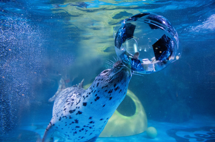 [서울=뉴시스] 코엑스아쿠아리움이 2022 카타르 월드컵 개막을 앞두고 우리나라 월드컵 대표팀의 선전을 기원하는 퍼포먼스를 진행했다고 11일 밝혔다. 물범 오월이가 대한민국 승리를 응원하며 헤딩을 하고 있다. (사진=코엑스아쿠아리움 제공) 2022.11.11. [email protected] *재판매 및 DB 금지