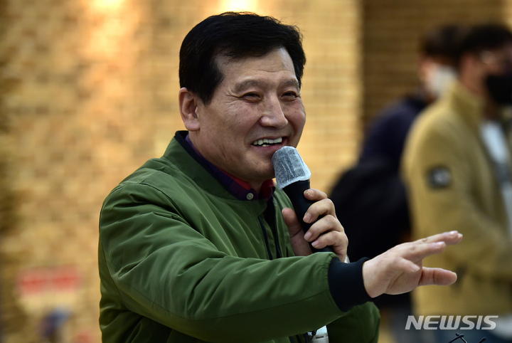 [안동=뉴시스] 이무열 기자 = 경북 봉화군 아연광산에서 작업 중 매몰됐다가 221시간 만에 극적으로 구조된 광부 박정하(62)씨가 11일 오전 안동병원 1층 로비에서 열린 퇴원 기자회견에서 소감을 밝히고 있다. 2022.11.11. [email protected]