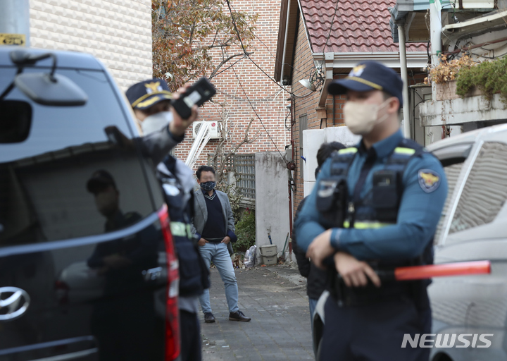 [서울=뉴시스] 김근수 기자 = 용산경찰서 전 정보계장이 숨진 채 발견된 가운데 11일 오후 서울 용산경찰서 전 정보계장 자택 앞에서 경찰들이 출입을 통제하고 있다. 2022.11.11. [email protected]
