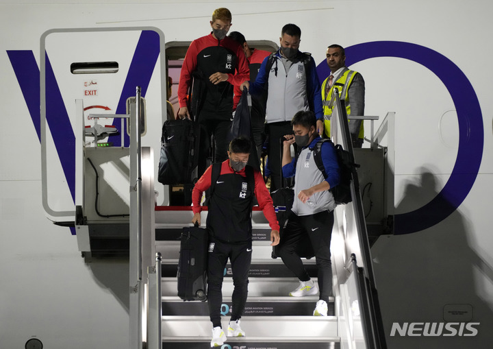 [도하=AP/뉴시스] 한국 축구대표팀 선수들이 14일(현지시간) 카타르 도하의 하마드 국제공항에 도착해 비행기에서 내리고 있다. 한국은 오는 24일 2022 카타르 월드컵 조별리그 H조 우루과이와 첫 경기를 치른다. 2022.11.14.