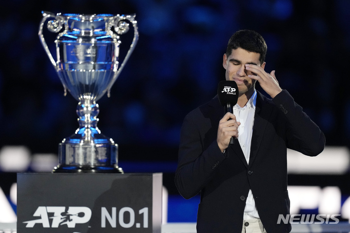 [토리노=AP/뉴시스] 카를로스 알카라스(스페인)가 16일(현지시간) 이탈리아 토리노에서 열리고 있는 2022 남자프로테니스(ATP) 파이널스에서 세계 랭킹 1위 트로피를 받은 후 소감을 말하고 있다. 올해 연말 19세 7개월이 되는 알카라스는 남은 대회 결과와 관계없이 남자 단식 세계 1위를 확정하면서 최연소 1위 기록을 세웠다. 2022.11.17.