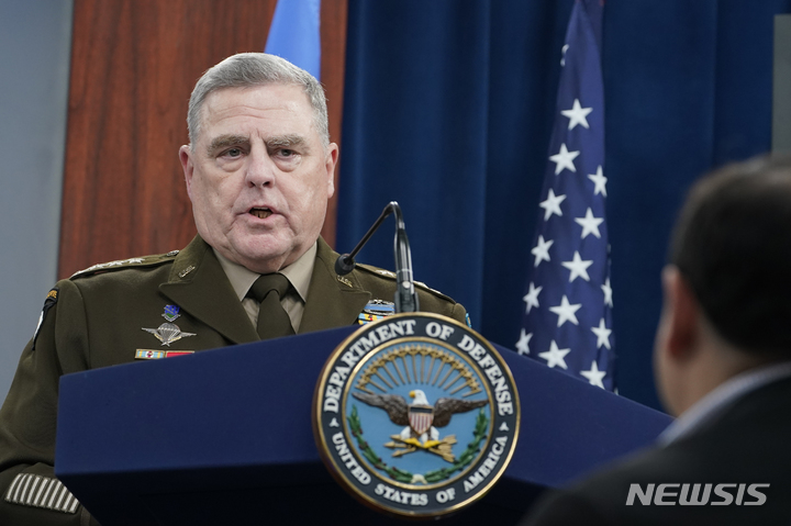 [워싱턴=AP/뉴시스] 마크 밀리 미 합참의장이 16일(현지시간) 워싱턴 국방부 청사에서 기자회견하고 있다. 밀리 합참의장은 우크라이나가 러시아와의 전쟁에서 완전히 승리할 가능성은 낮다며 우크라이나에 종전 협상을 강조했다. 2022.11.17.