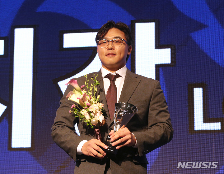 [서울=뉴시스] 김금보 기자 = 17일 오후 서울 중구 웨스틴 조선 서울 그랜드볼룸에서 열린 2022 KBO 퓨처스리그 시상식에서 퓨처스리그 투수부문-북부리그 평균자책점상을 수상한 LG 트윈스 이지강이 기념촬영을 하고 있다. 2022.11.17. [email protected]