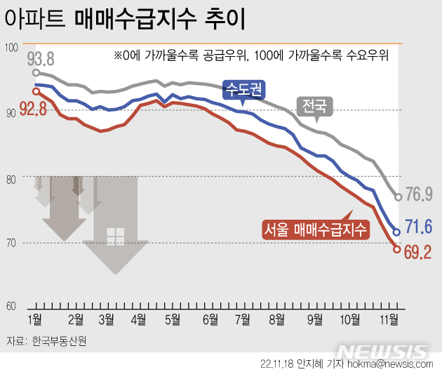 [서울=뉴시스] 18일 한국부동산원에 따르면 11월 둘째주 서울 아파트 매매수급지수는 69.2로 지난주(70.7)보다 1.5포인트 하락하며 지수 70선이 무너졌다. 2012년 8월 첫째주(67.5) 이후 10년3개월 만에 가장 낮은 수치다. (그래픽=안지혜 기자)