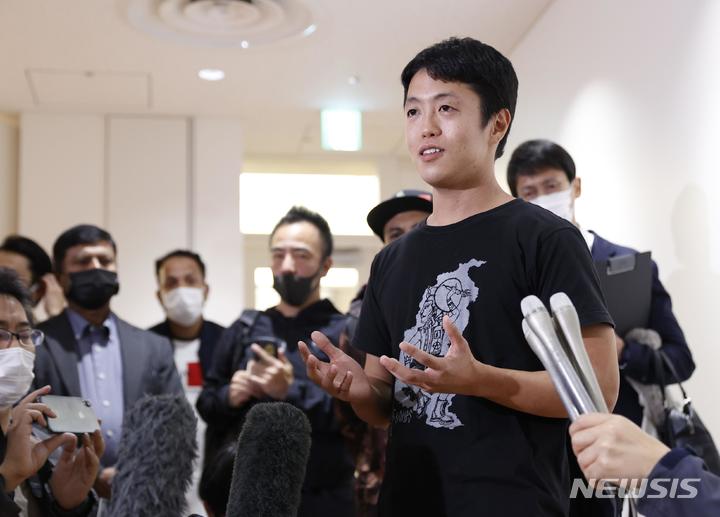 [도쿄=AP/뉴시스] 미얀마 군부로부터 석방된 일본 다큐멘터리 제작자 구보타 도루가 18일 도쿄 하네다 국제공항에 도착해 기자들에게 말하고 있다. 미얀마 군부는 17일 국경일을 맞아 재소자 5774명에 대한 사면을 발표하고 석방한 외국인들을 추방했다. 여기엔 호주 경제학자 숀 터넬, 비키 보먼 전 주미얀마 영국 대사, 일본인 구보타 도루, 미국인 차우 흐타이 우 등 외국인 4명도 포함됐다. 2022.11.18
