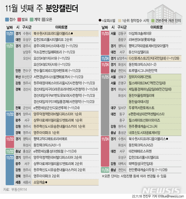 [서울=뉴시스] 19일 부동산R114에 따르면 11월 넷째 주에는 전국 7개 단지에서 총 2430가구(일반분양 1946가구)가 분양을 시작한다. (그래픽=전진우 기자)