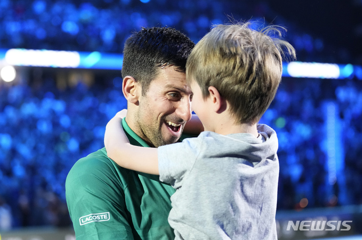 [토리노=AP/뉴시스] 노바크 조코비치(8위·세르비아)가 20일(현지시간) 이탈리아 토리노에서 열린 2022 남자프로테니스(ATP) 파이널스 단식 결승전에서 캐스퍼 루드(4위·노르웨이)를 물리친 후 아들과 포옹하고 있다. 조코비치는 루드를 세트 스코어 2-0(7-5 6-3)으로 물리치고 이 대회 6번째 우승을 차지했다. 2022.11.21.