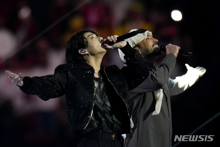[알코르=AP/뉴시스] 방탄소년단(BTS)의 정국이 20일(현지시간) 카타르 알코르의 알 바이트 스타디움에서 열린 2022 카타르 월드컵 개막식 무대에서 공연하고 있다. 정국은 카타르 국민가수 파하드 알 쿠바이시와 함께 이번 대회 공식 주제가인 '드리머스(Dreamers)'를 열창했다. 2022.11.21.