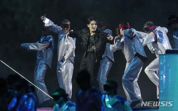 [알코르=AP/뉴시스] 방탄소년단(BTS)의 정국이 20일(현지시간) 카타르 알코르의 알 바이트 스타디움에서 열린 2022 카타르 월드컵 개막식 무대에서 공연하고 있다. 정국은 카타르 국민가수 파하드 알 쿠바이시와 함께 이번 대회 공식 주제가인 '드리머스(Dreamers)'를 열창했다. 2022.11.21.