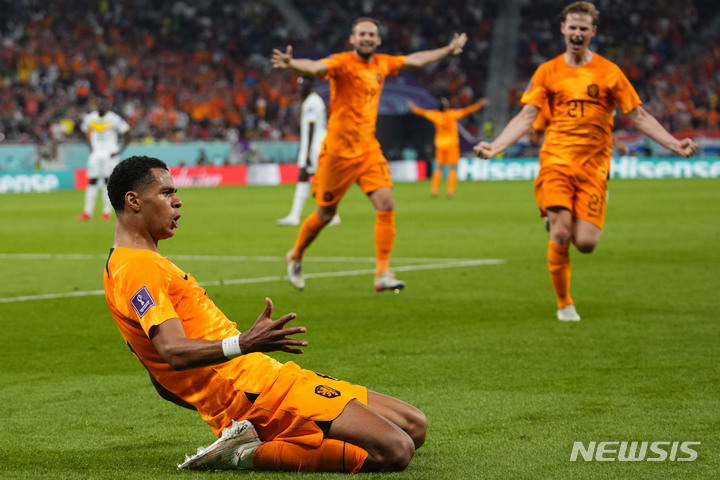 [도하=AP/뉴시스] 네덜란드의 코디 각포가 21일(현지시간) 카타르 도하의 알투마마 경기장에서 열린 2022 카타르 월드컵 조별리그 A조 1차전 세네갈과의 경기 후반 39분 선제골을 넣고 환호하고 있다. 네덜란드는 후반 54분 다비 클라선의 쐐기 골을 묶어 세네갈에 2-0 승리를 거뒀다. 2022.11.22.