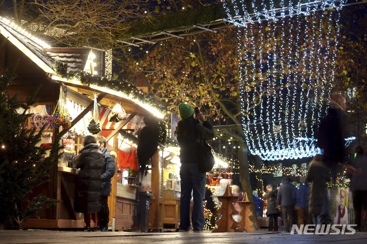 [프랑크푸르트=AP/뉴시스] 21일(현지시간) 독일 프랑크푸르트의 브라이차이트 광장에서 전통 크리스마스 마켓이 개장해 시민들이 곳곳을 방문하고 있다. 2022.11.22.