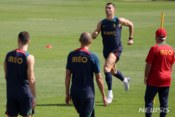 [알샤하니야(카타르)=뉴시스] 백동현 기자 = 크리스티아누 호날두를 비롯한 포르투갈 축구대표팀이 22일(현지시간) 카타르 알 샤하니야 스포츠클럽 트레이닝센터에서 훈련하고 있다. 2022.11.22. [email protected]