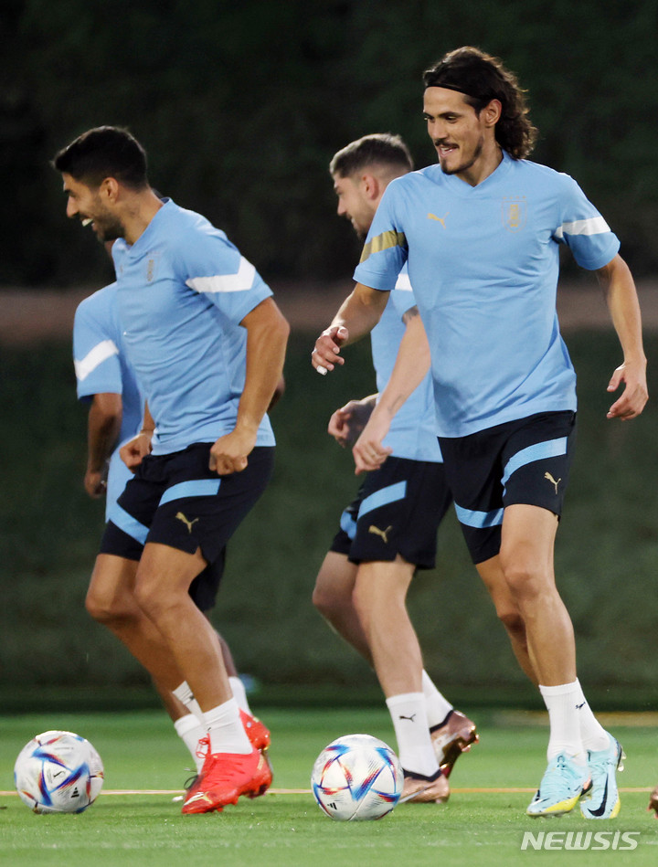 [도하(카타르)=뉴시스] 조성우 기자 = 우루과이 축구대표팀 수아레즈, 카바니 등 선수들이 23일(현지시간) 오후 카타르 도하 알 에르살 트레이닝센터에서 훈련을 하고 있다. 2022.11.23. [email protected]