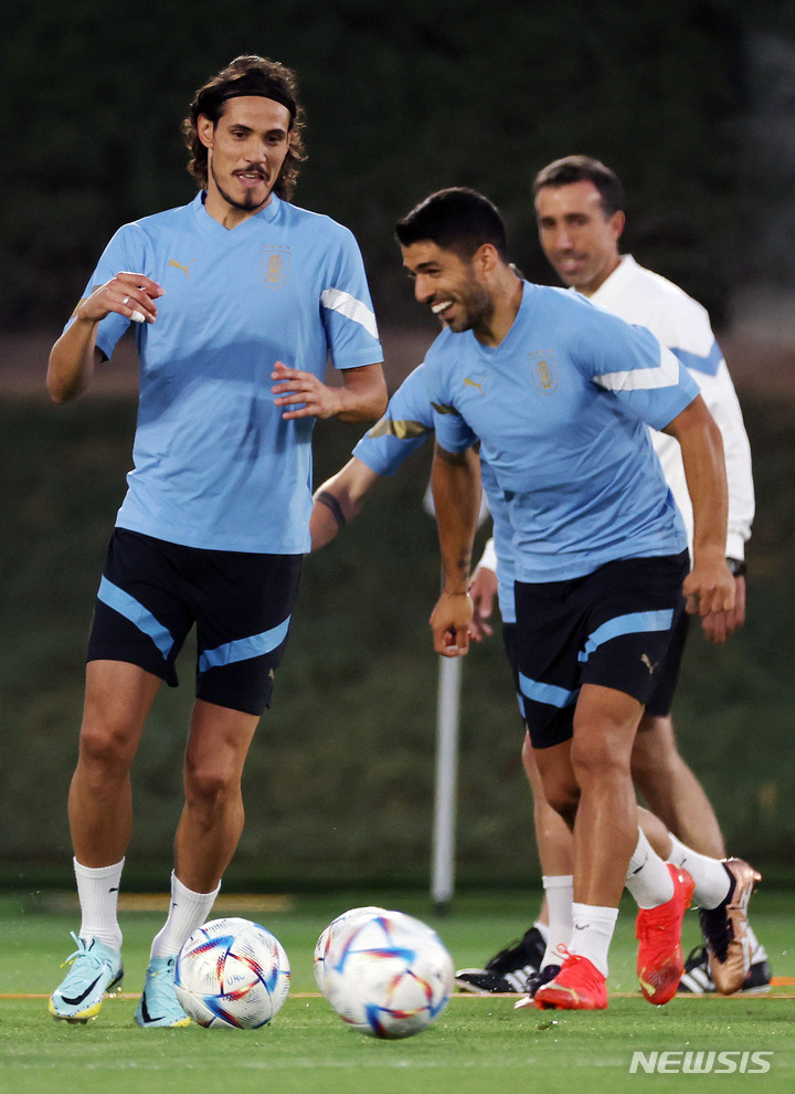 [도하(카타르)=뉴시스] 조성우 기자 = 우루과이 축구대표팀 카바니, 수아레즈가 23일(현지시간) 오후 카타르 도하 알 에르살 트레이닝센터에서 훈련을 하고 있다. 2022.11.23. [email protected]