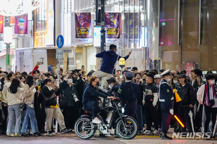 [도쿄=AP/뉴시스] 24일 일본 도쿄의 시부야 거리에서 일본 축구팬들이 2022 카타르 월드컵 일본 축구 대표팀이 독일을 상대로 승리한 것을 축하하고 있다. 일본은 전날 카타르 알라이얀의 할리파 인터내셔널 스타디움에서 열린 조별리그 E조 1차전에서 우승 후보인 독일에 2-1 역전승을 거뒀다. 일본이 월드컵에서 독일을 이긴 것은 이번이 처음이다. 2022.11.24.