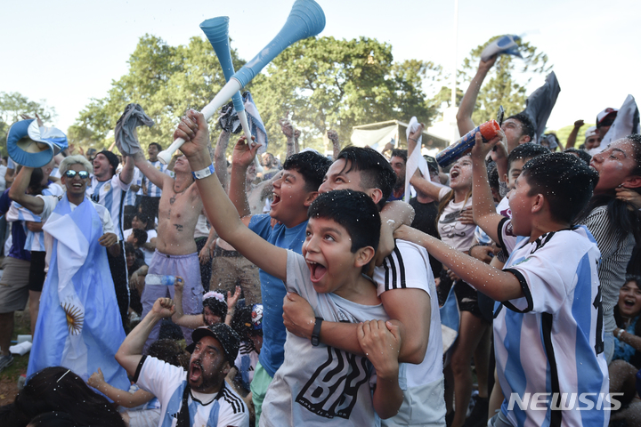 [부에노스아이레스=AP/뉴시스] 26일(현지시간) 아르헨티나 부에노스아이레스에서 축구팬들이 아르헨티나와 멕시코의 2022 카타르 월드컵 조별리그 C조 2차전 경기를 보며 응원하고 있다. 이 경기에서 리오넬 메시가 1골 1도움을 기록하며 2-0 승리를 이끌었다. 2022.11.27.