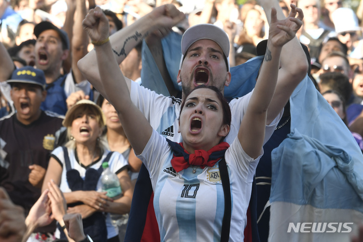 [부에노스아이레스=AP/뉴시스] 26일(현지시간) 아르헨티나 부에노스아이레스에서 축구팬들이 아르헨티나와 멕시코의 2022 카타르 월드컵 조별리그 C조 2차전 경기를 보며 응원하고 있다. 이 경기에서 리오넬 메시가 1골 1도움을 기록하며 2-0 승리를 이끌었다. 2022.11.27.