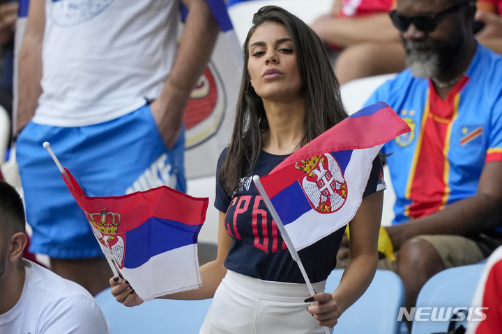 [알와크라=AP/뉴시스] 28일(현지시간) 카타르 알와크라의 알 자누브 경기장에서 한 세르비아 축구팬이 2022 카타르 월드컵 세르비아와 카메룬의 조별리그 G조 2차전 경기 시작을 기다리며 응원하고 있다. 2022.11.28.