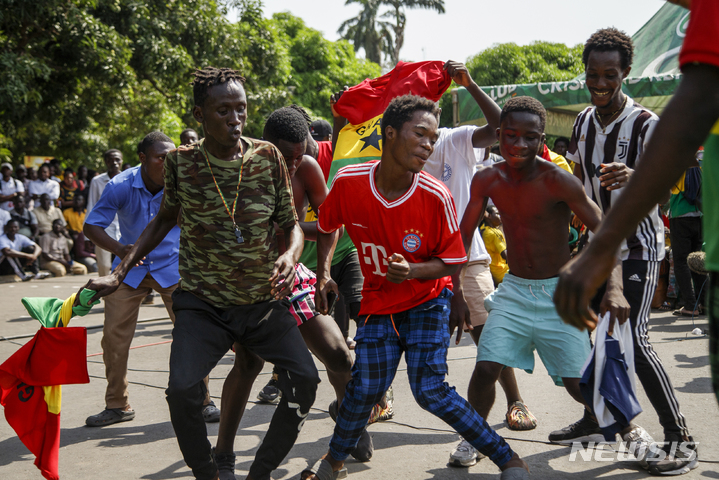 [아크라=AP/뉴시스] 가나 축구팬들이 28일(현지시간) 수도 아크라의 국영방송국 밖에 마련된 TV 화면 앞에서 2022 카타르 월드컵 조별리그 H조 2차전에서 가나가 한국을 이긴 것에 환호하며 춤추고 있다. 2022.11.29.
