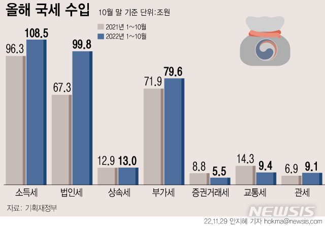 [서울=뉴시스] 29일 기획재정부에 따르면 올해 1∼10월 누계 기준 국세 수입은 355조6000억원으로 작년 대비 48조2000억원(15.7%) 증가했다. 세목별로 보면 기업실적 개선으로 법인세(99조8000억원)가 32조5000억원 증가했다. 증권 거래 대금이 줄어 증권거래세 세입도 5조5000억원으로 지난해 같은 기간(8조8000억원)보다 37.0% 감소했다. (그래픽=안지혜 기자)