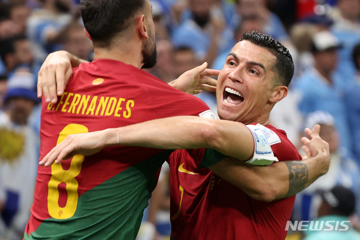 [루사일(카타르)=뉴시스] 백동현 기자 = 28일(현지시간) 카타르 루사일 스타디움에서 열린 2022 카타르 월드컵 조별리그 H조 2차전 포르투갈과 우루과이의 경기, 포르투갈 호날두가 브루노 페르난데스의 득점 때 기뻐하고 있다. 2022.11.29. [email protected]