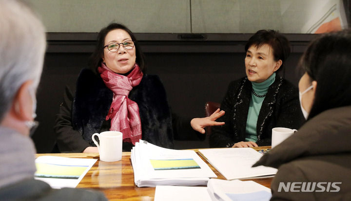 [서울=뉴시스] 추상철 기자 = 이현(왼쪽부터) 작가와 강금실 지구와사람 대표가 29일 오후 서울 용산구 지구와사람에서 지구와사람 후원을 위한 이현 그림전 '색채유희' 기자간담회를 하고 있다. 2022.11.29. [email protected]