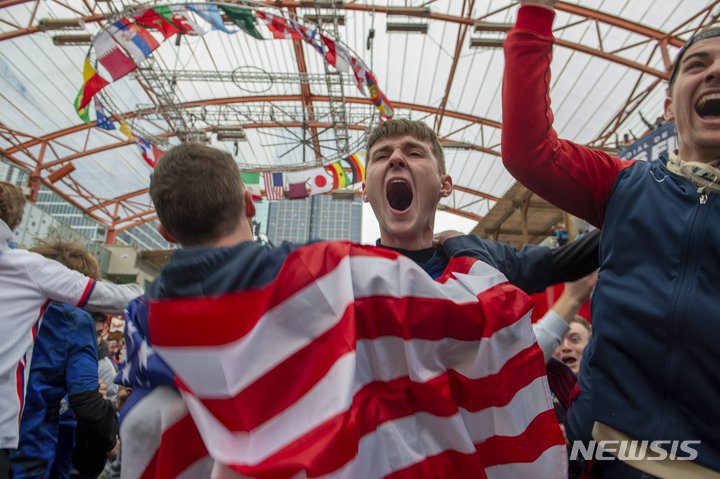 [캔자스시티=AP/뉴시스] 29일(현지시간) 미 미주리주 캔자스시티에서 2022 카타르 월드컵 조별리그 B조 미국과 이란의 경기를 지켜보던 축구 팬들이 미국이 득점하자 환호하고 있다. 미국은 이란을 1-0으로 꺾고 8년 만에 16강에 올랐다. 2022.11.30.