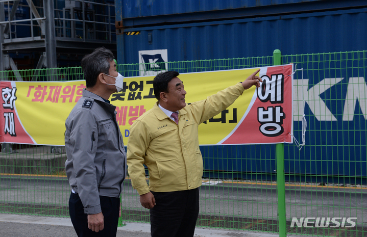 [울산=뉴시스] 배병수 기자 = 김두겸 울산시장이 민주노총 공공운수노조 화물연대본부 총파업 일주일째인 30일 오후 울산 남구 울산신항을 방문해 박성주 울산경찰청과 함께 컨테이너 야적장을 둘러보고 있다. 2022.11.30. [email protected]