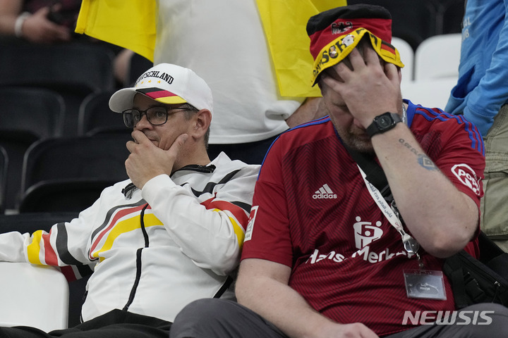 [알코르=AP/뉴시스] 1일(현지시간) 카타르 알코르 알바이트 스타디움에서 열린 2022 카타르 월드컵 조별리그 E조 3차전 독일과 코스타리카의 경기를 지켜보던 독일 축구팬들이 경기가 끝난 후 침통한 표정을 짓고 있다. 독일은 코스타리카를 4-2로 꺾어 일본에 패한 스페인과 승점이 같았으나 골 득실 차에서 밀려 16강 진출에 실패했다. 2022.12.02