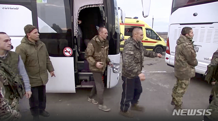 [모스크바=AP/뉴시스] 러시아 국방부가 공개한 영상 캡처 사진에 1일(현지시간) 우크라이나와 포로 교환으로 풀려난 러시아 군인들이 장소가 공개되지 않은 곳에 버스로 이동해 내리고 있다. 러시아와 우크라이나는 이날 각각 50명의 전쟁 포로를 맞교환했다. 2022.12.02.