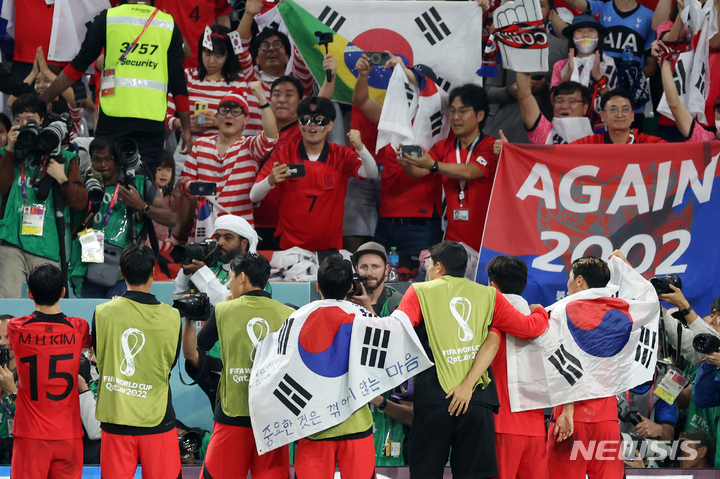 [알라이얀(카타르)=뉴시스] 조성우 기자 = 2일(현지시간) 카타르 알라이얀 에듀케이션 시티 스타디움에서 열린 2022 카타르 월드컵 H조 최종 3차전 대한민국과 포르투갈의 경기, 한국 선수들이 포르투갈에 2-1로 승리하며 16강 진출을 확정 지은 뒤 기뻐하고 있다. 2022.12.03. [email protected]